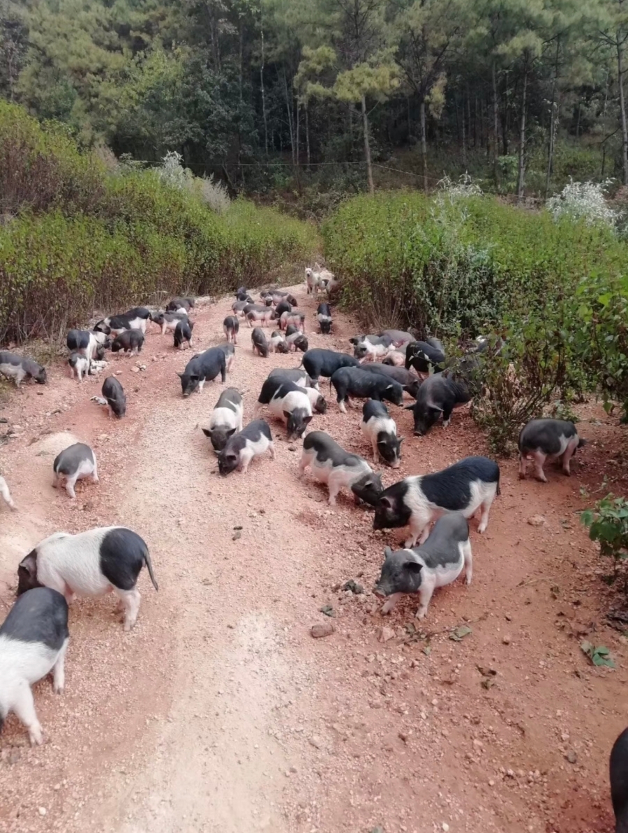 段朝金饲养的香猪群(资料图)。苏雪梅 摄