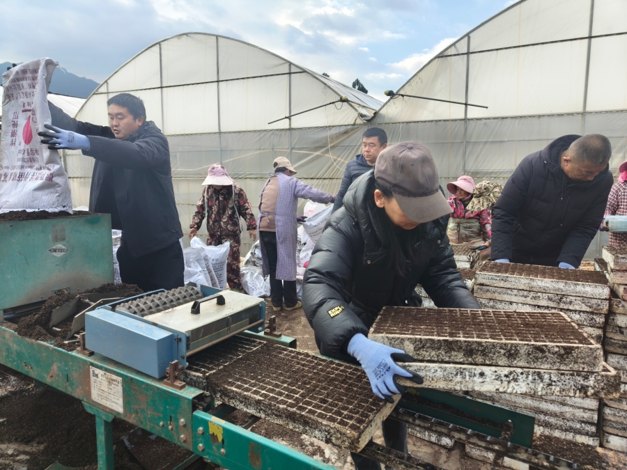 工作人员协助烟农搬运与整理育苗盘(2月19日摄)。王琼 摄