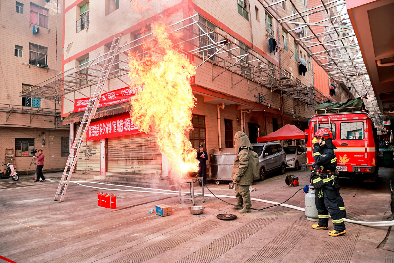 在错误示范环节,高温热油遇水后瞬间剧烈汽化,火光猛地蹿起,半米高的火柱扑面而来,现场瞬间“火光冲天”。这一幕让围观居民真切感受到“用水泼油锅灭火”的极大危险性。