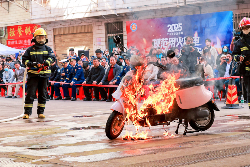 “电动自行车起火30秒内出现明火,80秒全面起火,100秒后释放大量有毒气体,极易造成人员窒息。”消防员现场讲解道,“破损、改装或过度充电的锂电池,一旦受到挤压碰撞,就可能引发剧烈燃烧,因此电动自行车严禁入户、严禁在楼道停放充电,必须到社区指定保管站集中充电。”