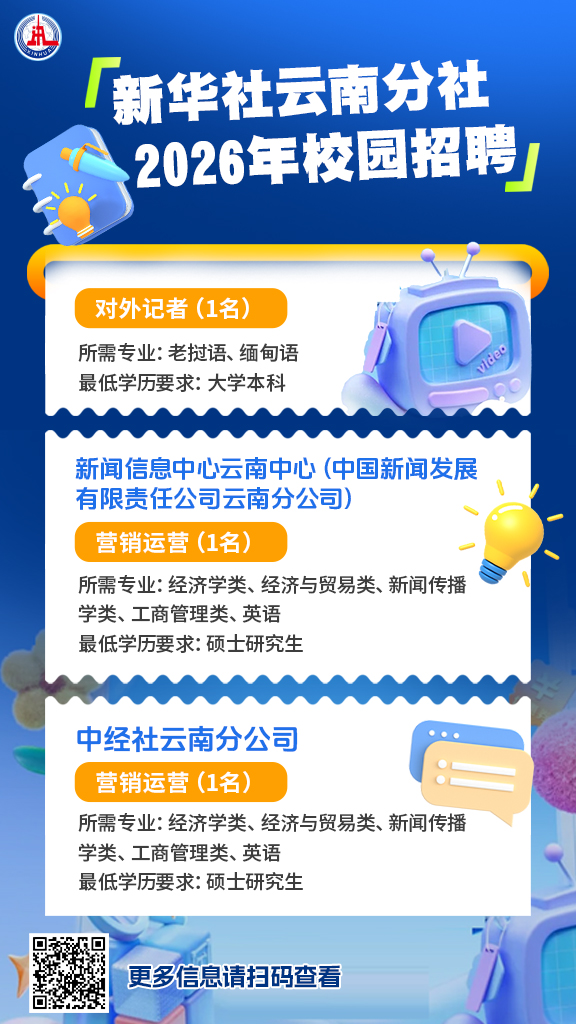 新华通讯社面向2026年应届高校毕业生公开招聘工作人员,此次共招聘169名工作人员,其中新华通讯社云南分社(含属地经营分支机构)招聘3名。