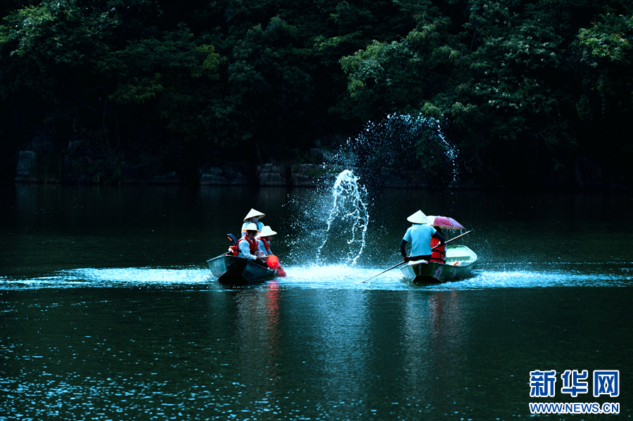 游客在普者黑景区乘船游玩,互相泼水嬉戏(2024年6月21日摄)。新华网发(刘起 摄)