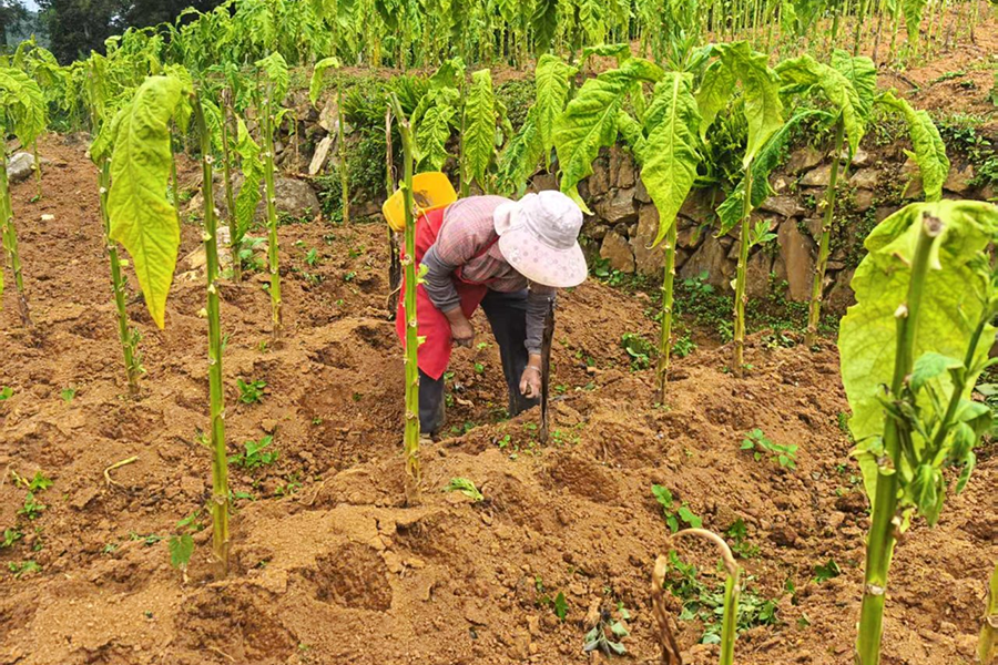 烟农正在烟地里播种黄豆(资料图)。