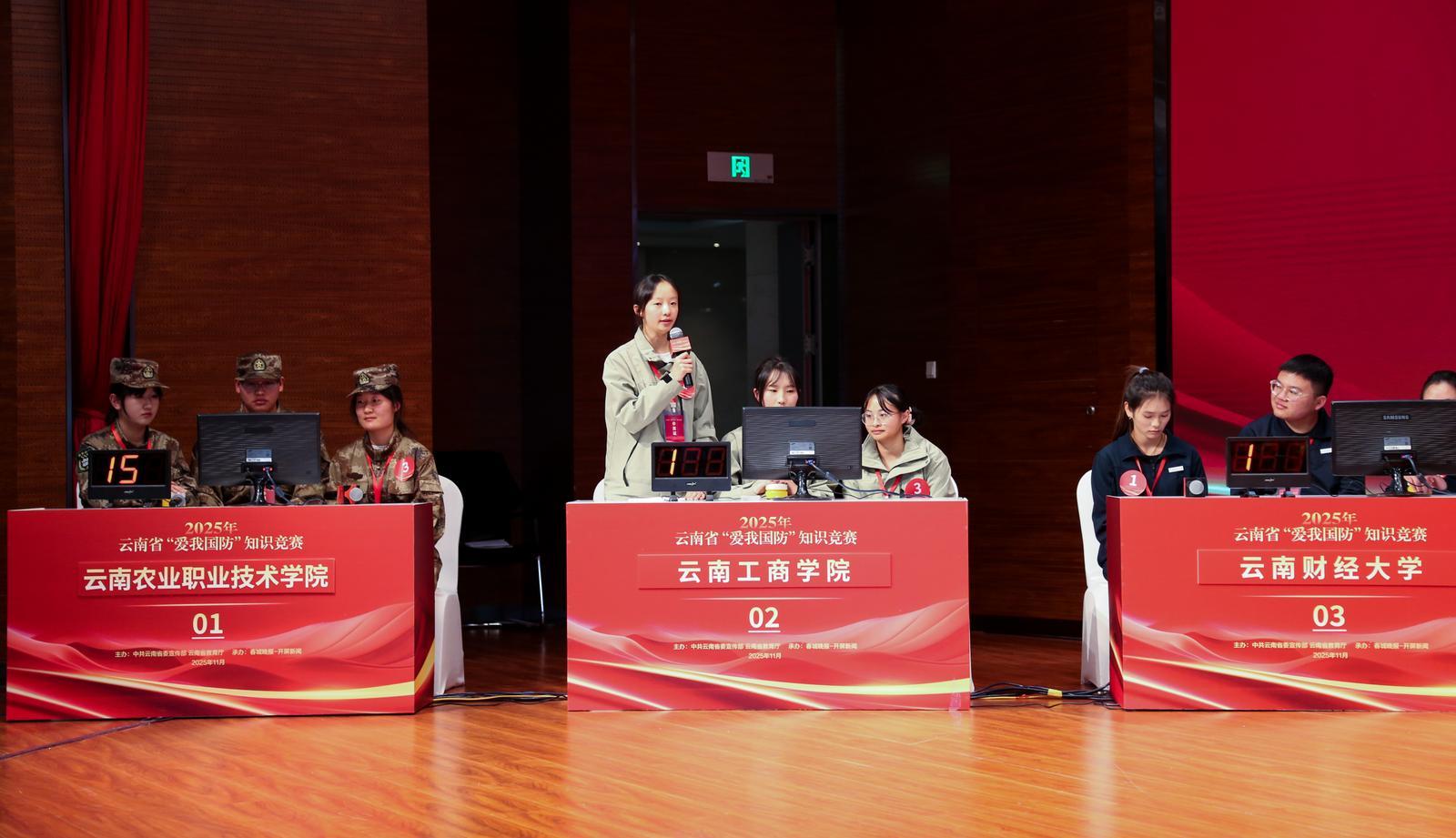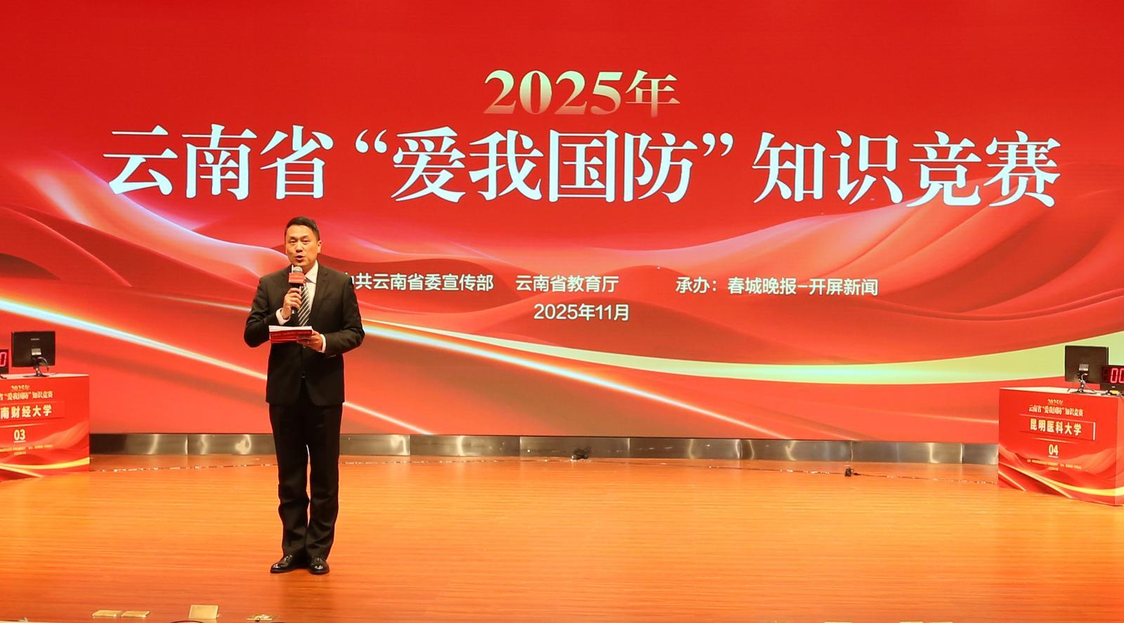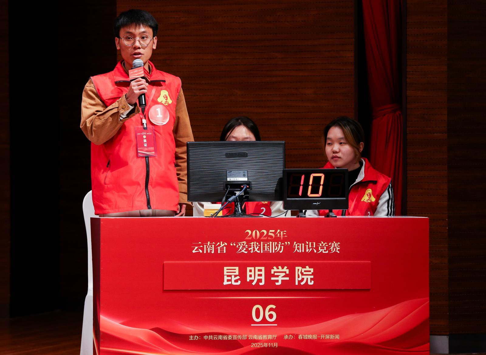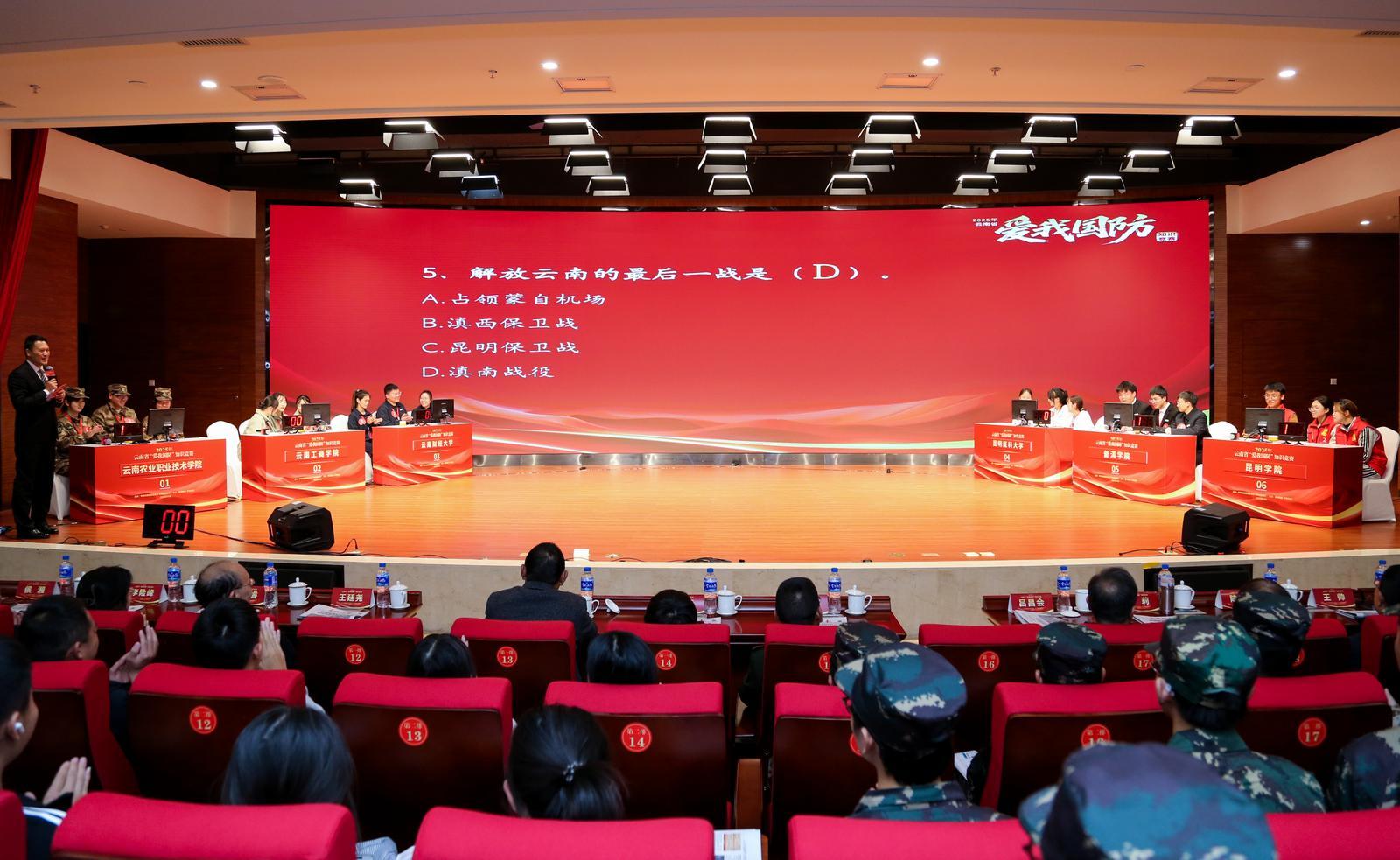11月26日,由中共云南省委宣传部、云南省教育厅主办,春城晚报-开屏新闻承办的2025年云南省“爱我国防”知识竞赛现场竞赛活动在昆明云报传媒广场举办。来自6所高校的参赛队伍齐聚一堂,围绕国防教育知识展开了一场激烈的较量。