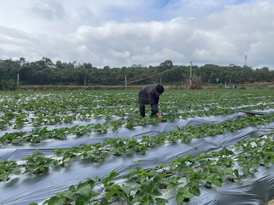 王毕飞正在进行草莓田间管理(11月3日摄)。何天晶 摄