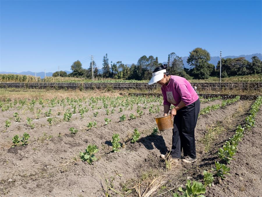 在云南省保山市腾冲市界头镇永乐村,一片片青翠的蚕豆苗与嫩绿的油菜在田间交错分布,勾勒出一幅生机勃勃的现代农业画卷。烟农王艳正在自家田里俯身为蚕豆追施肥料。