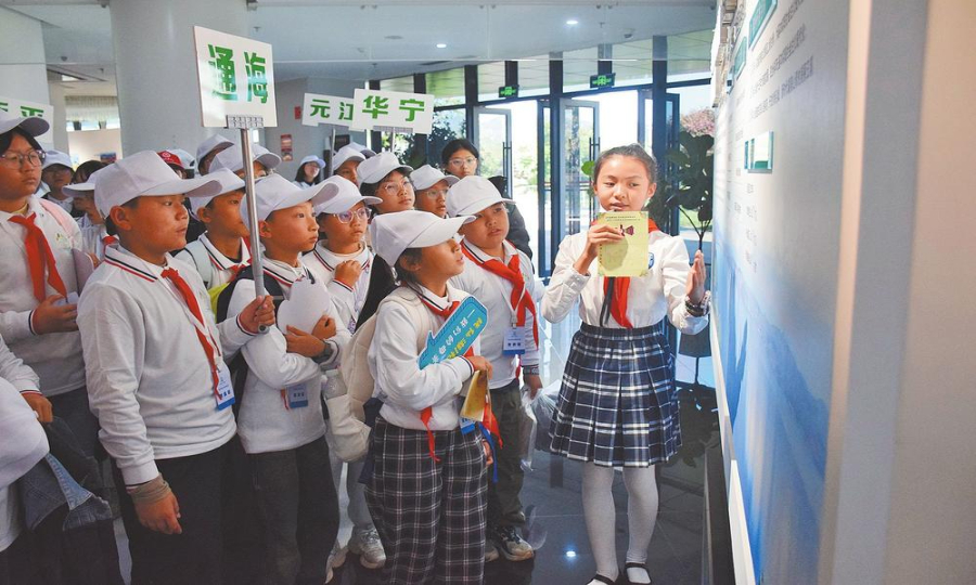 在“行”的环节,“小手拉大手”家庭环保行动全面铺开,产生联动效应。孩子们化身环保监督员,督促家长使用菜篮子代替塑料袋、仔细记录家庭用水量并踊跃参与社区垃圾分类活动。在云南江川星云湖国家湿地公园,学生组成的“红领巾巡湖队”沿湖清理垃圾,实地观察入湖河道水质情况;澄江市规划馆里,学生讲解员向游客介绍抚仙湖“湖泊革命”的历程;玉溪市科技馆里,“小小星火”红领巾讲解员向参观者介绍环保科技展品,分享生态环保知识,从节水节电的小发明到资源循环利用的新创意。