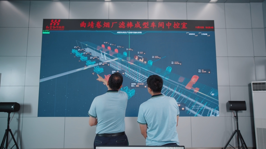 清晨的阳光透过玻璃窗,洒在曲靖卷烟厂生产调度指挥中心的大屏上。