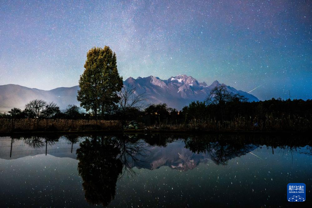 12月14日凌晨在云南省丽江市玉龙雪山脚下拍摄的双子座流星雨。新华社记者 胡超 摄