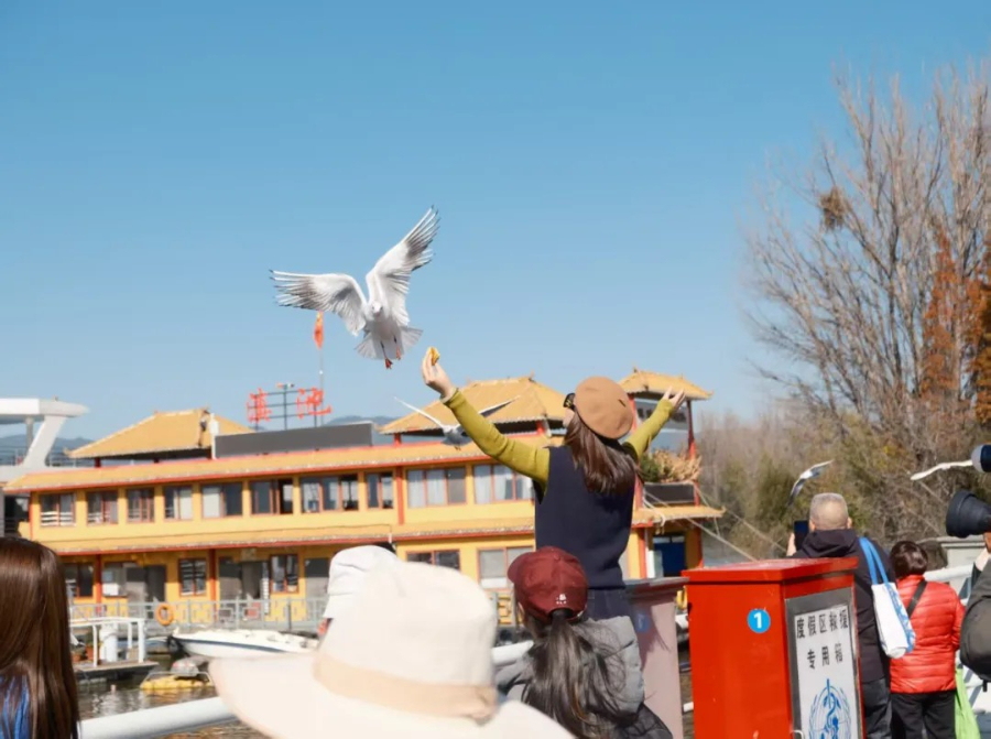 游客在滇池畔与红嘴鸥互动。陈思蒙 摄