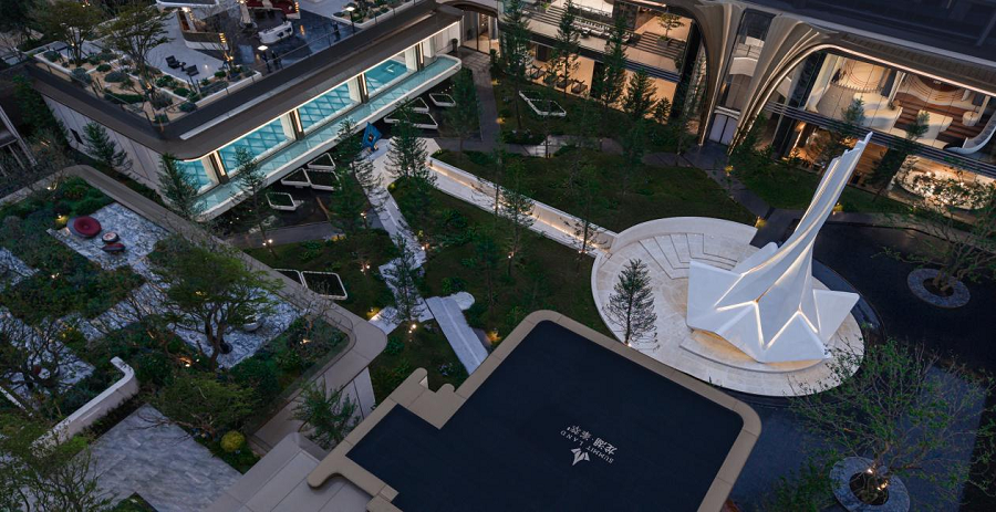 在产品设计上,项目打造的259平方米的户型,通过创新设计,实际使用面积可达约333平方米。这个户型拥有270度环幕巨厅、约53平方米的空中花园和42平方米的主卧套房,旨在将住宅的空间层次感与大平层的开阔感融为一体,以满足部分业主的居住需求。