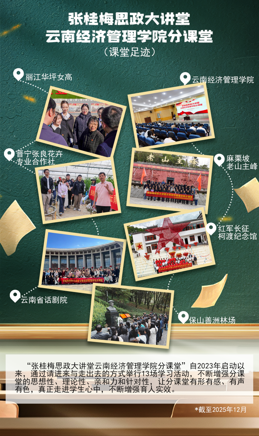 自2023年以来,云南经济管理学院持续办好、用好“张桂梅思政大讲堂云南经济管理学院分课堂”,通过请进来、走出去、线上线下相结合的方式,充分发挥好“张桂梅思政大讲堂”的政治感召力、理论说服力、实践吸引力、示范引领力,持续突出政治引领、价值引领、云南特色、实践特点和师生需求,着力将“张桂梅思政大讲堂云南经济管理学院分课堂”打造为学校思政第一“金课”。