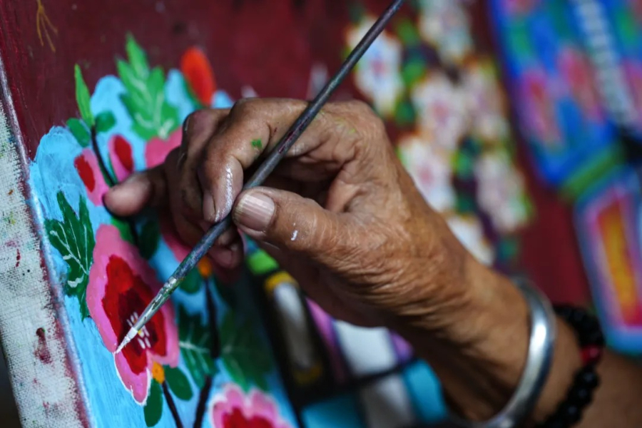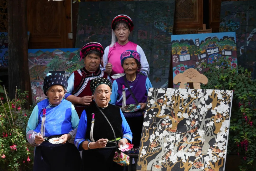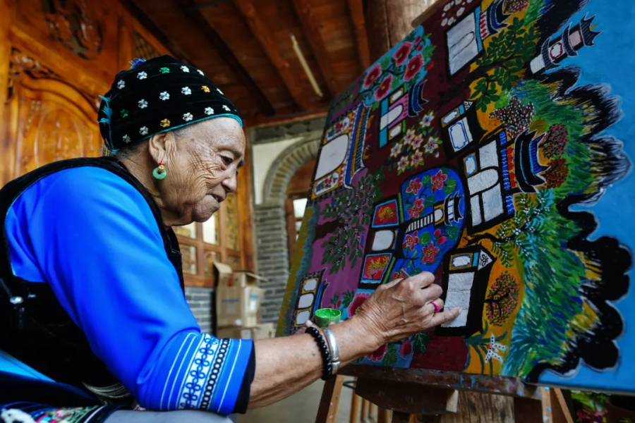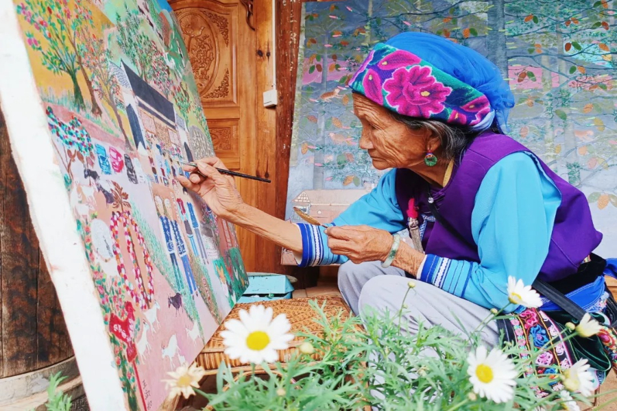 日子久了,奶奶们画出了自己的风格:王秉秀用色浓烈如刺绣,赵新莲绘山水气势恢宏,李艳丽画山间小景雅致灵动。她们还借鉴白族彩绘,翻遍山野收集30多种颜色的泥土,研磨成粉调成颜料,画出的“泥土画”满是苍山的质朴气息。