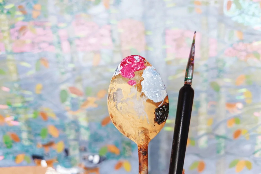 王秉秀的“调色盘”,是一把吃饭用的铁勺——勺柄锈迹斑斑,勺心盛着几抹饱满、流动的色彩。她举起这把“调色盘”自豪地说:“我画了100多幅画了,一幅画最高能卖8万块钱呢。”
