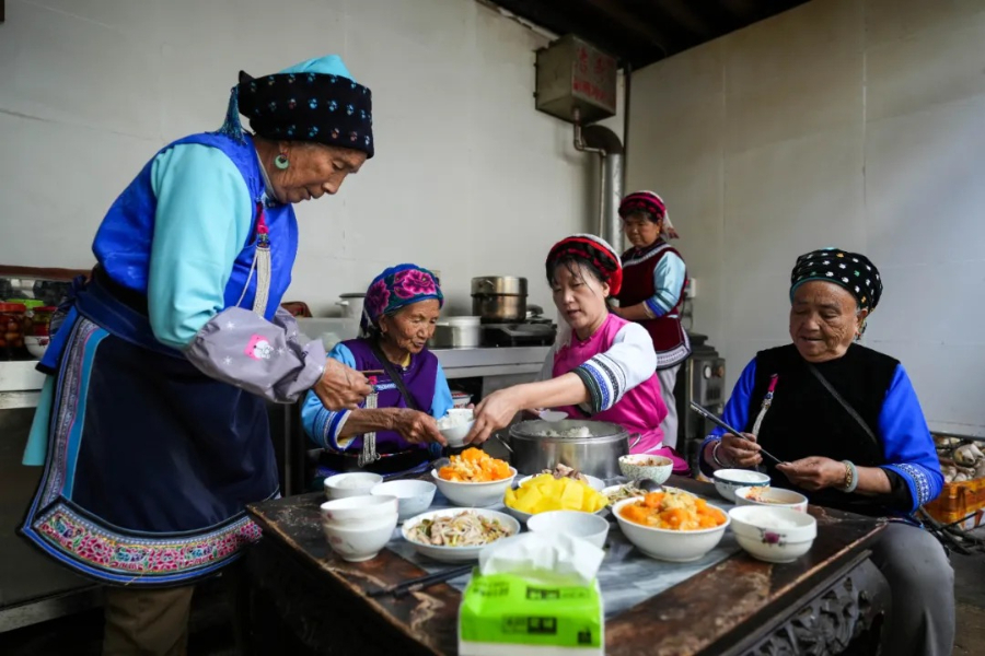 中午时分,伙山村的奶奶们在“农民画社”吃饭,她们一起创作油画、一起吃饭。郝亚鑫 摄