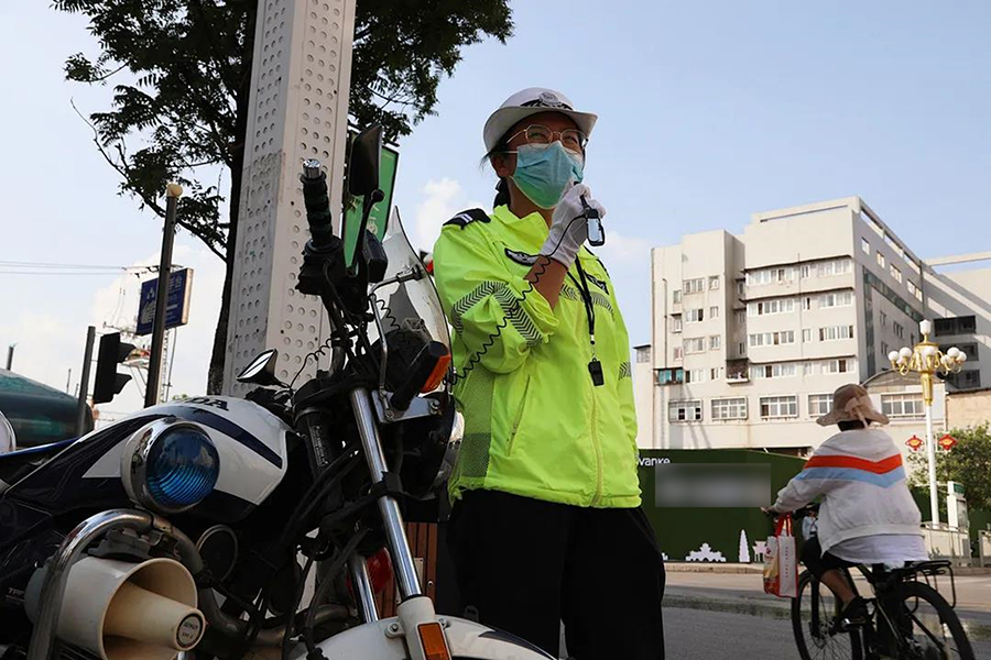 路口喊话提醒群众佩戴安全头盔(资料图)。