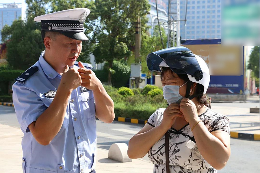 执勤交警教群众规范佩戴安全头盔(资料图)。