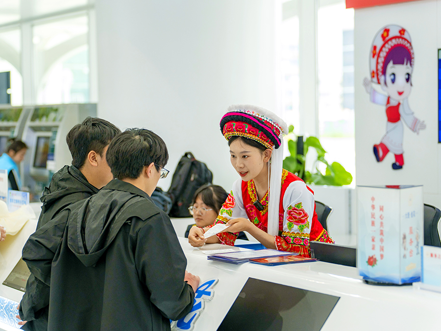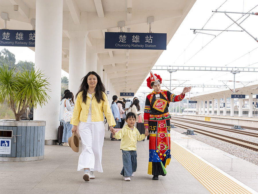 楚雄站职工身着民族服饰引导旅客出站(资料图)。张世强 摄