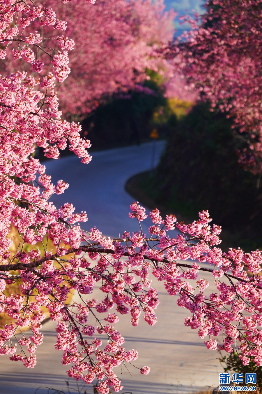 朝阳下盛开的冬樱花(2025年12月31日摄)。新华网发(刘子安 摄)
