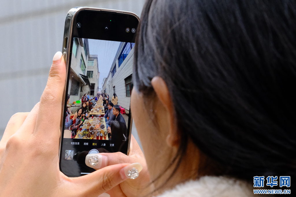 游客用手机拍摄哈尼长街宴(1月4日摄)。新华网发(张洪科 摄)