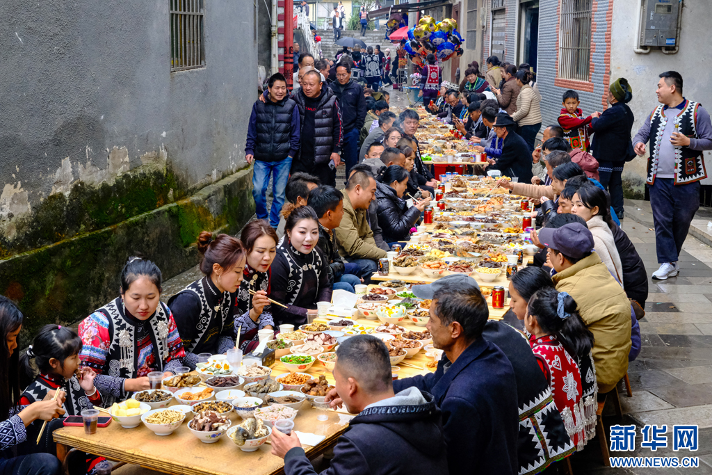 游客与村民一起体验哈尼长街宴(1月4日摄)。新华网发(张洪科 摄)