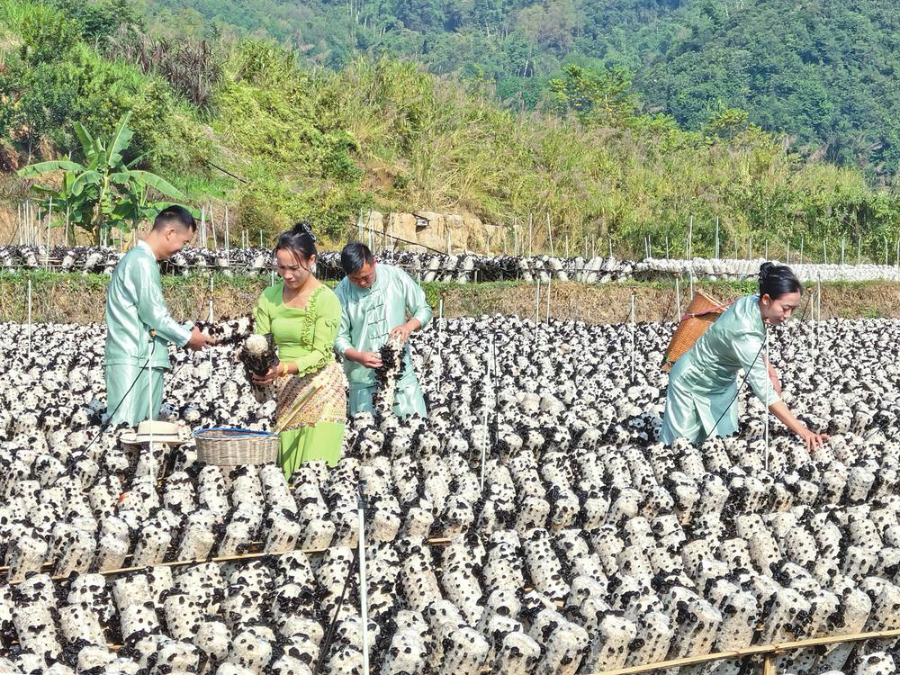 近日,梁河县梁冠菌业有限公司的生态食用木耳迎来今年首次采收,种植户在农技人员的指导下细心采摘、分装打包。目前,该公司建成近300亩木耳种植基地,年产木耳200多吨,产品远销浙江、福建、上海等地,产值逾千万元,带动近千名村民每年人均增收上万元。图为种植户采摘首茬木耳。记者 管毓树 摄