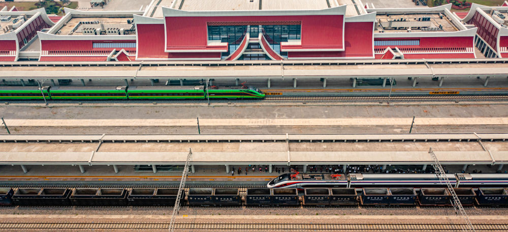 “复兴号”(上)、“澜沧号”动车组列车停靠在中老铁路磨憨站。(无人机照片,新华社记者胡超 摄)