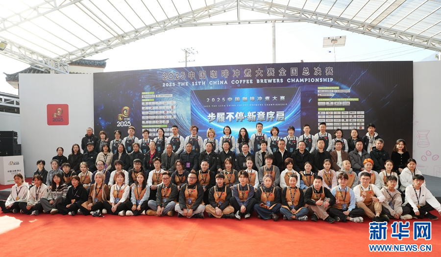 2025中国咖啡冲煮大赛全国总决赛在云南保山举行,图为与会嘉宾、参赛选手、赛事评委合影(摄于1月16日)。新华网发(郭康 摄)