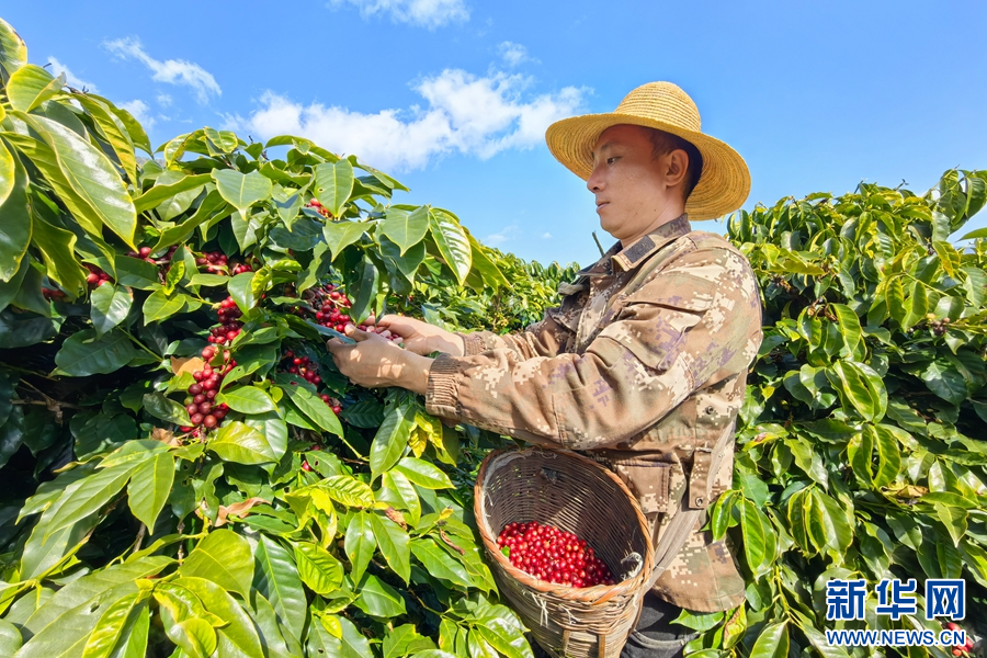 有着“中国咖啡第一村”美誉的保山新寨村,咖农正在采摘咖啡豆(摄于1月15日)。新华网 赵普凡 摄