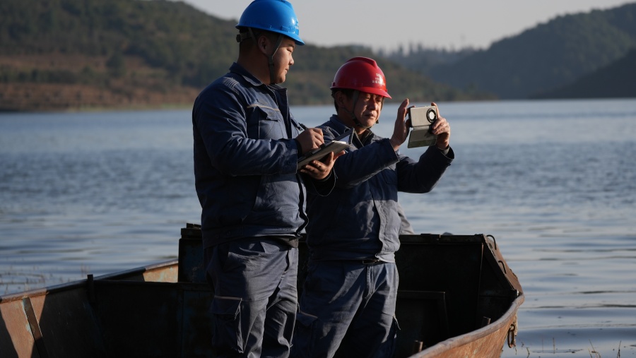 1月13日,富源供电局墨红供电所人员乘船对10千伏玉麦线进行线路巡视。阮松萍 摄