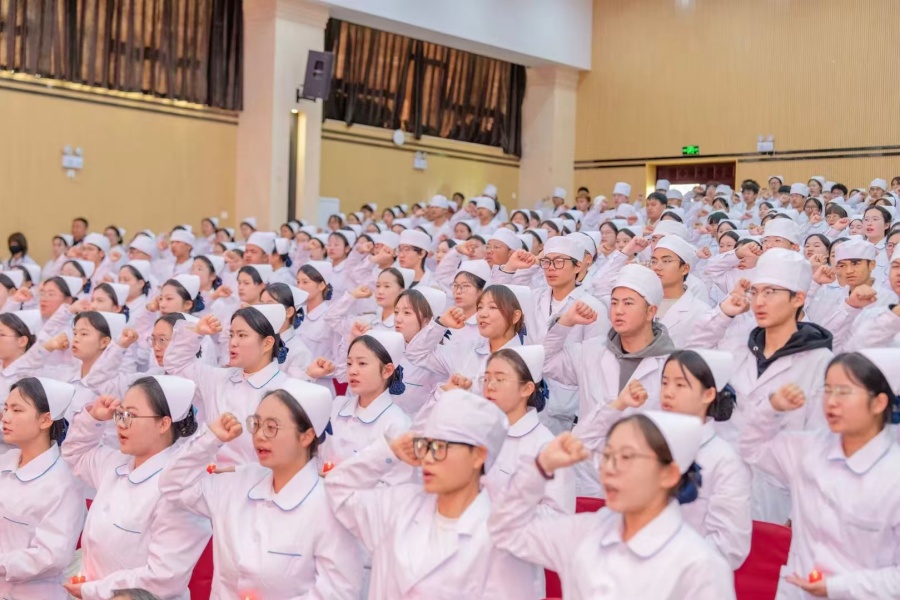 现场,王克荣、刘小娟与学院教师为学生代表授护士帽,全体新生手捧烛光庄严诵读南丁格尔誓言。