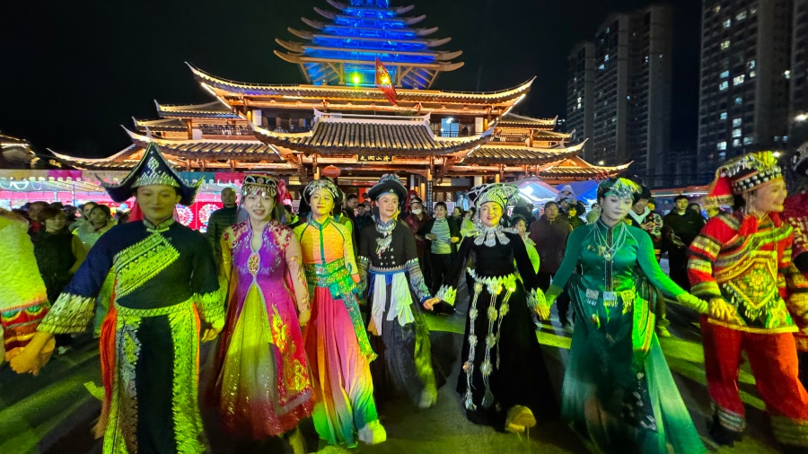 在当晚直播镜头中,七都古镇化身“露天博物馆”:非遗工坊内,苗族蜡染的蓝白纹样在匠人指尖流淌;三七书屋里,5000册地方文献与旅居阅读空间静候读者;美食街区中,三七炖鸡的香气,在苗族医药传承人同步讲解下,更添风味。而当篝火点燃非遗大舞台,壮族手巾舞的柔美、彝族弦子舞的欢快引得游客与市民共舞,将“夜娱”从观赏升级为全民参与的文化狂欢。网友留言:“这里没有千篇一律的夜市,只有扎根土地的文化生命力。”