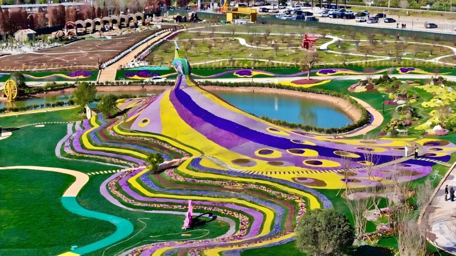 郁金香园栽植约30万株郁金香,百花园则布展约40万盆花卉,为花海增添浪漫寓意,不同色块的波浪式排布与不同花型的高低错落,其中特意留出蜿蜒小径,让游客可步入花田中央,获得被鲜花环绕的沉浸感。