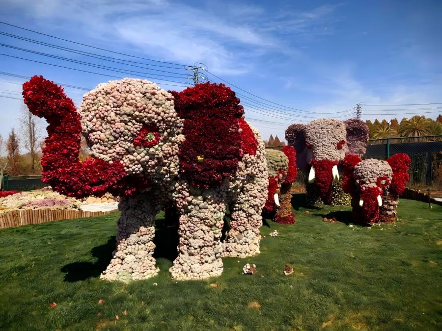 花海由大孔雀、多肉园、百花园、郁金香园等十大核心板块构成。整体以孔雀开屏为核心主题,辅以蝴蝶恋花、蜜蜂飞舞、马到成功等吉祥地面花纹为衬托,将“祝福美好、开心每时每刻”的美好期许藏于每一寸花境之中。全园累计用花约200万盆,涵盖上百个花卉品种,实现万花齐放、四季有景的盛景。