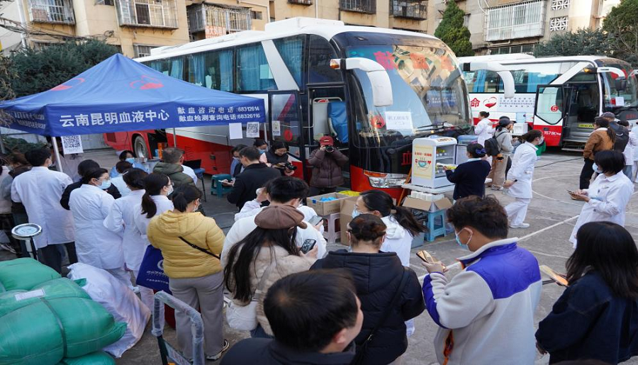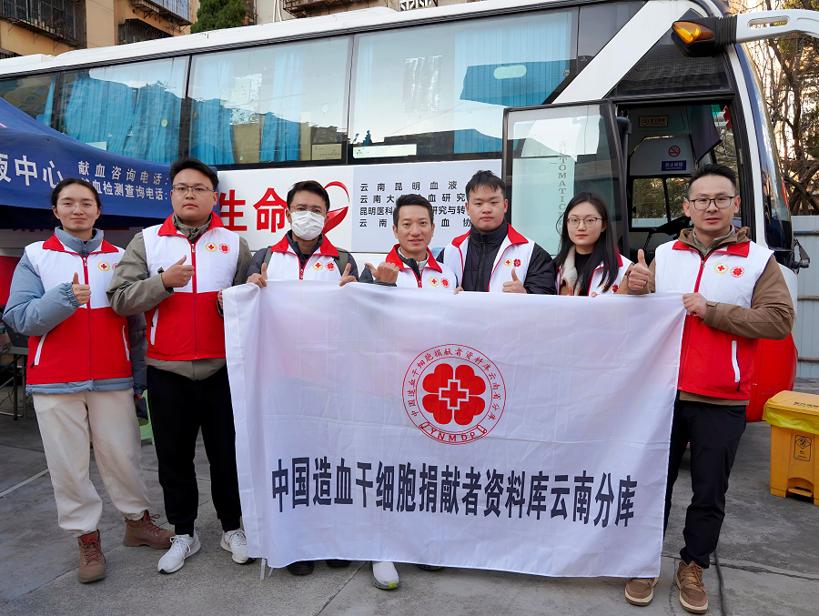中国红十字会捐献造血干细胞暨无偿献血志愿服务总队云南省大队在云南省第一人民医院积极配合无偿献血现场服务工作(2月5日摄)。
