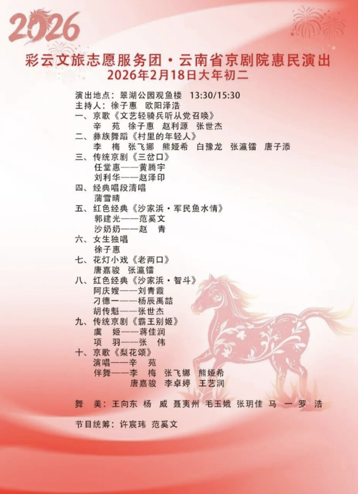 为弘扬中华优秀传统文化,丰富春节期间人民群众文化生活,推进文旅志愿服务与文化传承、民族团结、生态保护等深度融合,根据云南省文化和旅游厅有关工作要求,云南省京剧院将于2026年春节期间在昆明市翠湖公园举行“彩云文旅志愿服务团·云南省京剧院惠民演出活动”。届时,欢迎广大游客朋友们前往翠湖公园观看演出。(完)