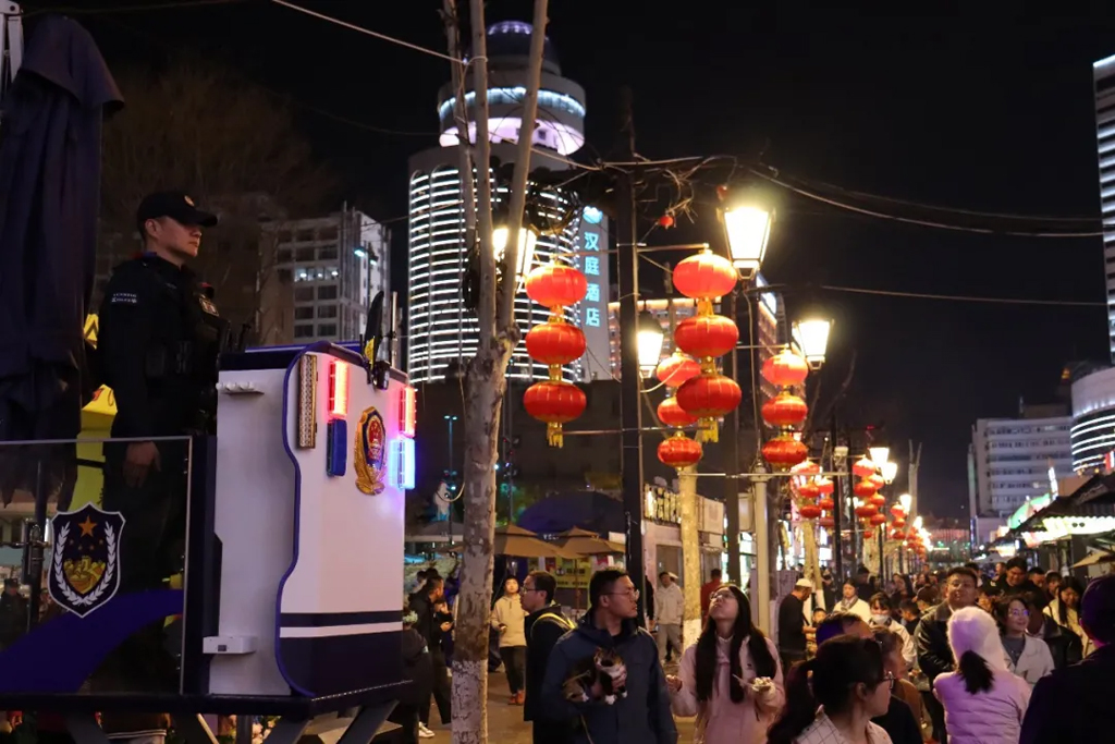 凌晨的南强街巷,商户陆续打烊,巡逻民警李建安带领辅警逐户检查商铺消防设施、电源关闭情况,叮嘱商家做好收尾安全工作。他说,“春节期间用电用火多,消防隐患不能大意,我们多走一步、多查一遍,群众就多一分安心”。