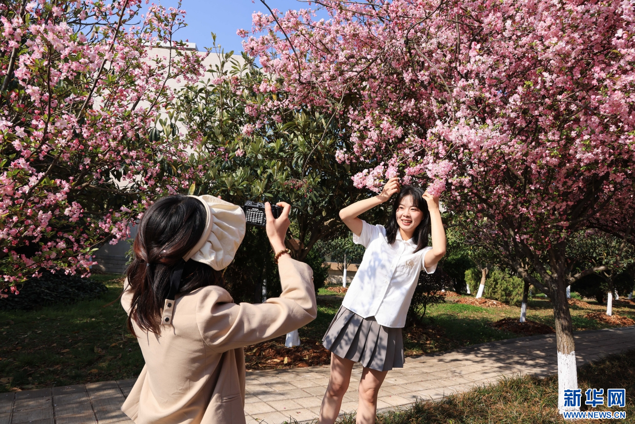 3月1日,游客在云南省曲靖市曲靖师范学院赏景拍照。新华网发(孙文来 摄)