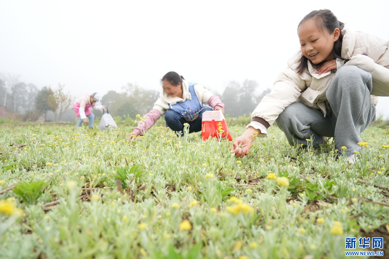 2月28日,在云南省水富市永安村,村民在田间采摘火草。新华网发(狄廷秀 摄)