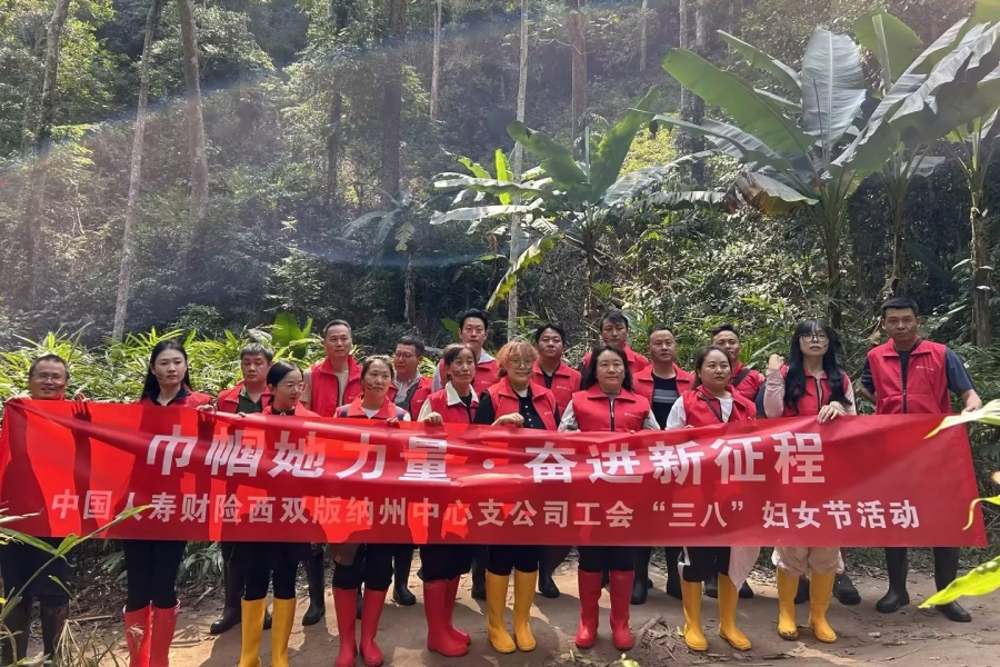 中国人寿财险西双版纳州中心支公司女职工们雨林徒步后合影留念(3月6日摄)。李扬 摄