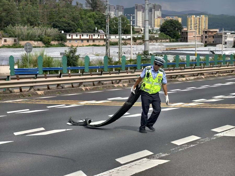 外勤二大队民警捡拾路面散落物(资料图)。