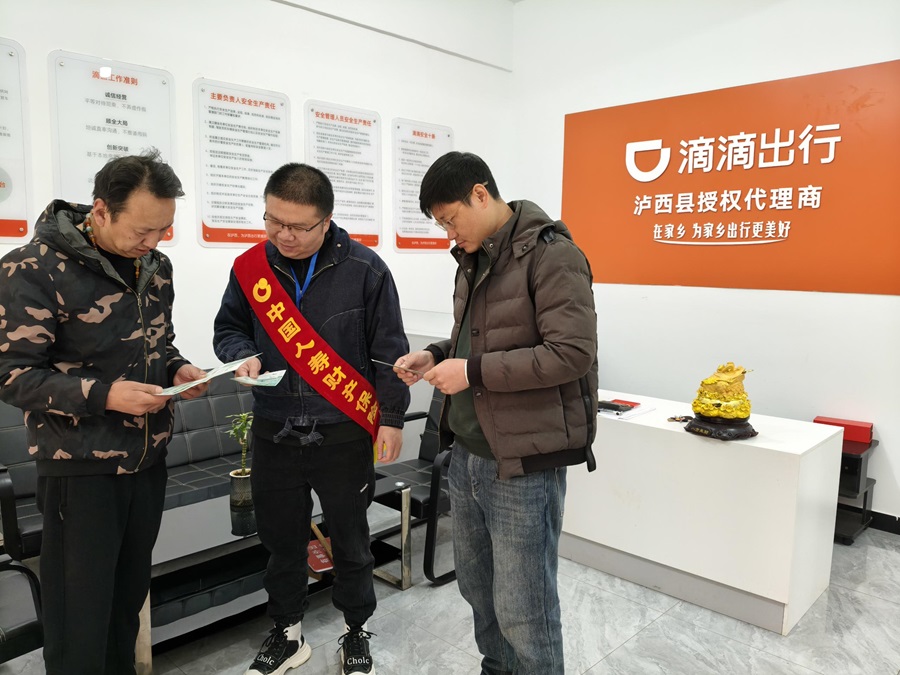 中国人寿财险泸西县支公司工作人员为网约车司机讲解金融知识(3月10日摄)。
