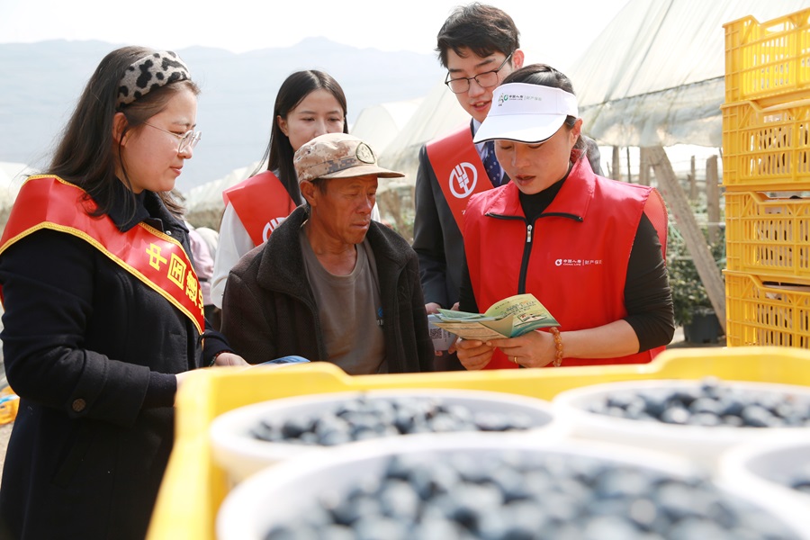 中国人寿财险红河州中心支公司工作人员为蓝莓种植户宣讲金融知识(3月10日摄)。薛莹莹 摄