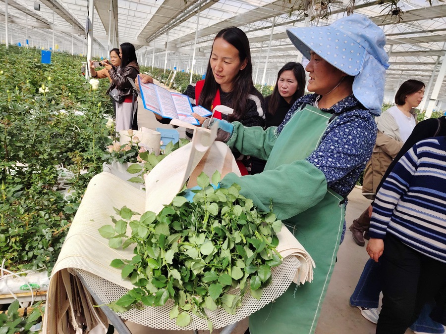 中国人寿财险丽江市中心支公司工作人员为花农普及金融消保知识(3月7日 摄)。