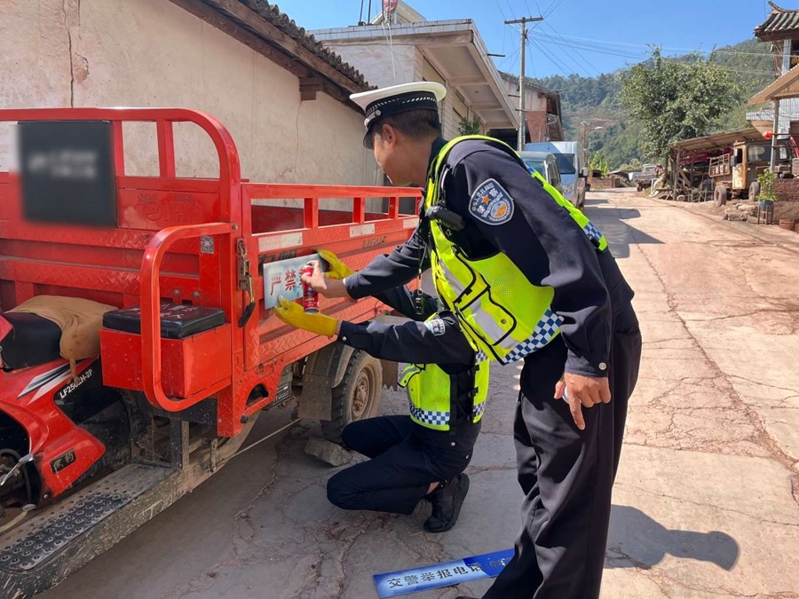 各地公安交管部门在三轮摩托车车厢喷涂“严禁违法载人”警示语,在车辆醒目位置广泛粘贴千余份“严禁载人”的安全提示贴,营造“上车即提醒”的浓厚氛围。昭通、大理、楚雄、怒江等地公安交管部门也结合辖区春季出行特点,依托“美丽乡村行”活动开展形式多样的交通安全宣传。