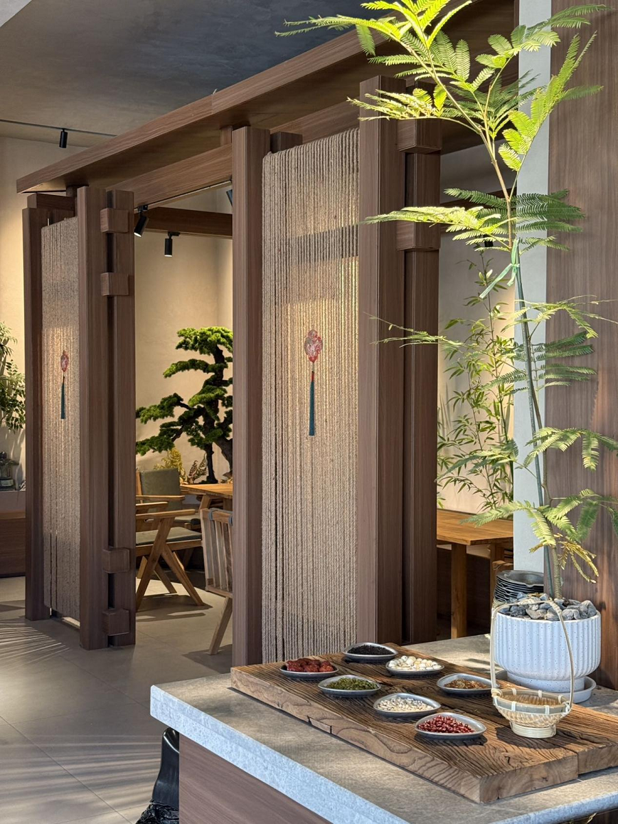 在空间设计上,门店以竹艺、绳结、编织元素贯穿,营造出商圈中雅致的休憩空间。除现制饮品与烘焙外,店内还延伸出售养生茶包、香氛、杯子等零售周边,成功构建了“饮用+体验+零售”的一体化消费场景。这种业态模式,不仅满足了消费者对健康饮品的需求,更提供了一种放松疗愈的生活方式。