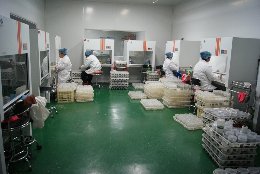 技术人员在接种室内工作(3月23日摄)。