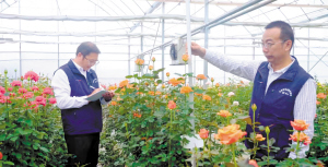 云南省花卉技术培训推广中心技术人员开展鲜切玫瑰种植技术指导与田间监测。供图