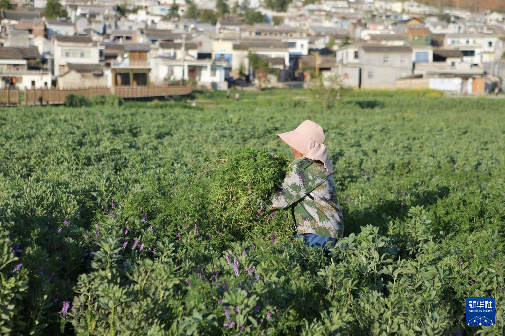 2026年3月24日,村民在白雾村的蚕豆地里除草。