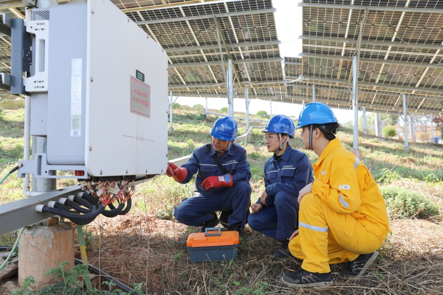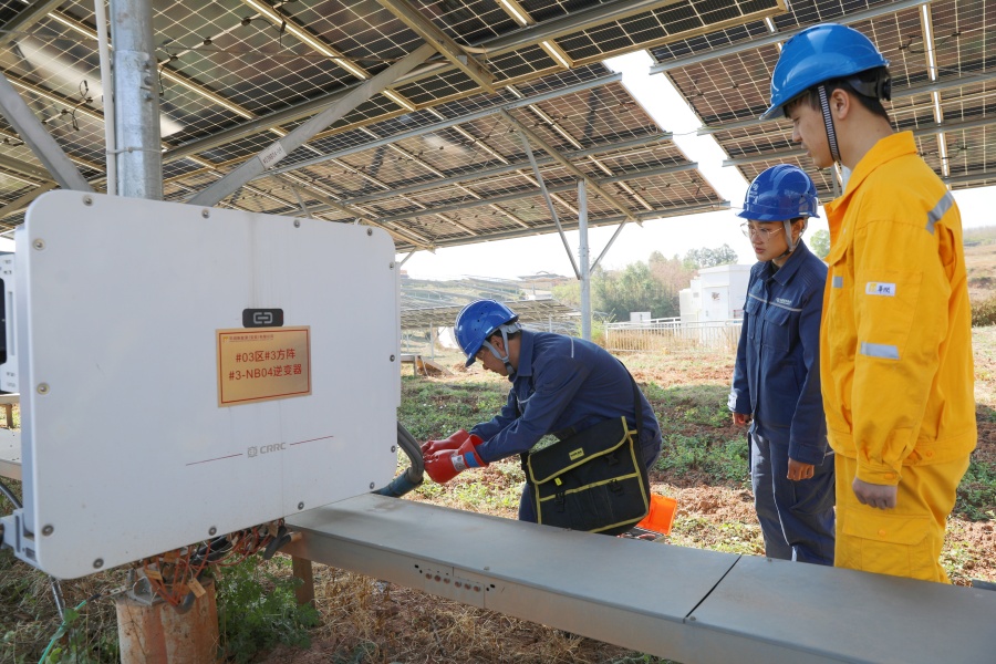 供电工作人员在华润宜良新发“药光互补”光伏发电项目检查并网设备,保障绿电稳定上网(3月19日摄)。张昕霞 摄